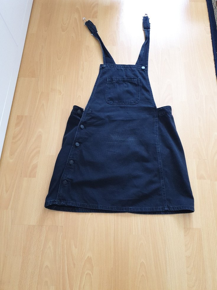 Ayarlanabilir askılı, ön cep detaylı lacivert kadın kısa salopet. Yan düğme detayları ve dayanıklı kumaş kullanılmış. Ön tarafta solma mevcut taşlanmış gibi