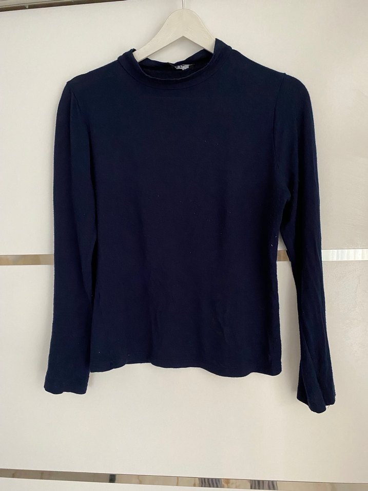Lacivert renkte, yüksek yakalı ve uzun kollu kadın dar kesimi ve sade tasarımıyla günlük sokak stiline uygun.