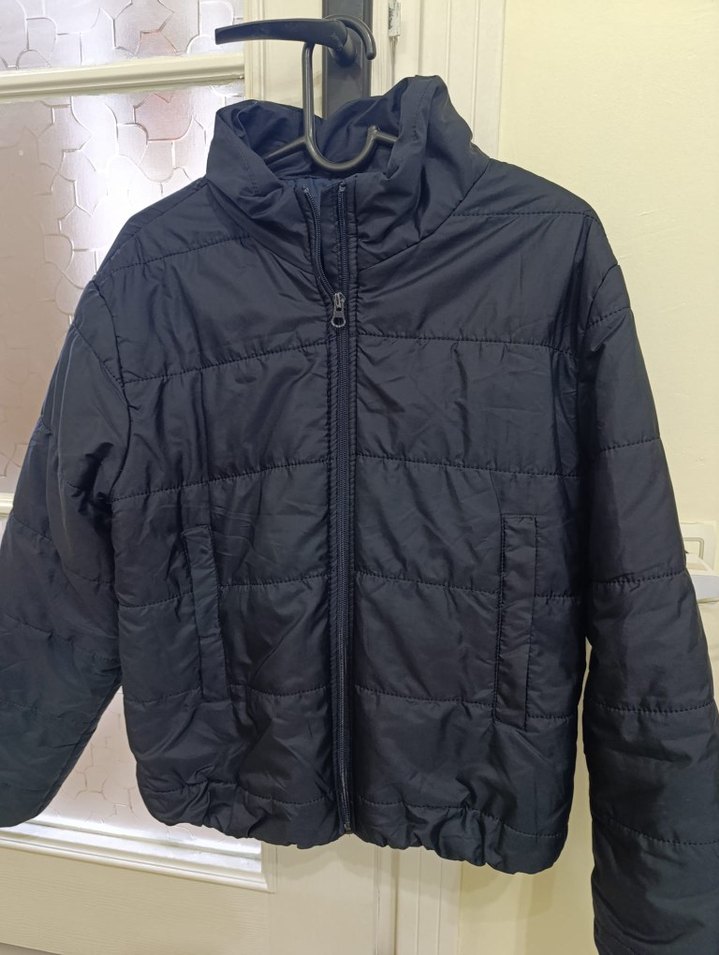 lacivert renkli, fermuarlı, yüksek yakalı kadın kışlık mont. İnce ve sıcak tutan kumaştan, uzun kollu ve normal boyda, günlük şık tarz için uygun. ❄️