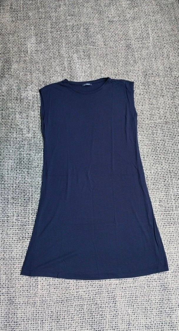 Lacivert kolsuz triko elbise, yuvarlak yaka ve bol kesimlidir. Uzun boyu ve sade tasarımıyla günlük kullanıma uygundur.