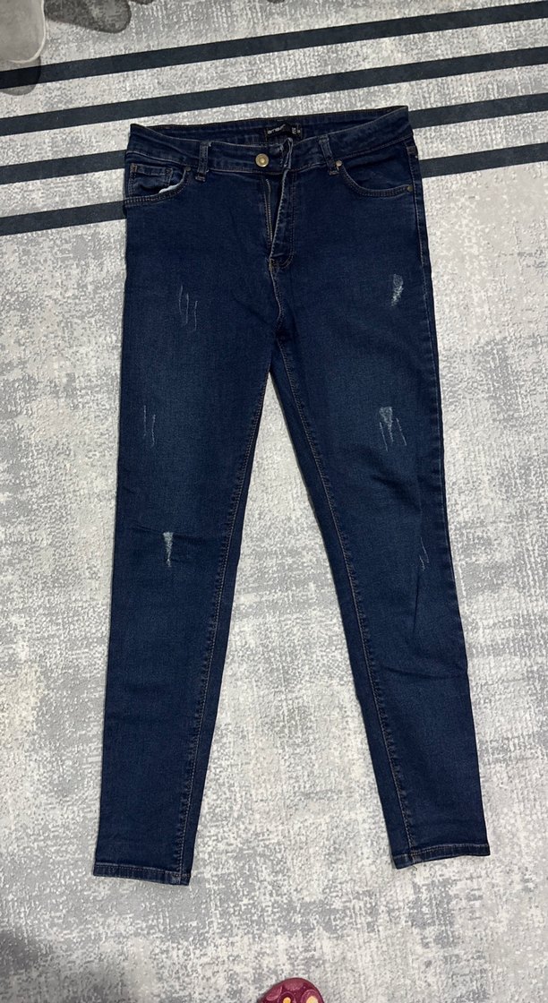 Lacivert kot pantolon, regular fit ve midi boyda, kemerli ve hafif yıpranmış detaylara sahip. Günlük rahat kullanım için uygundur.