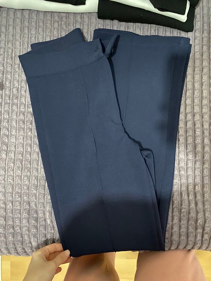Lacivert, normal boy midi kesim, yırtmaçlı kadın kumaş pantolon. Sentetik kumaştan, iş ortamına uygun sade ve klasik tarzda.