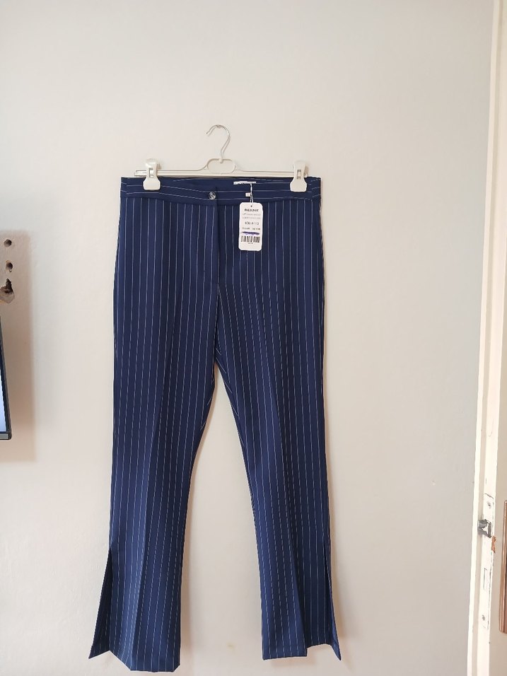 Mavi ve gri çizgili, pileli, normal boy kadın kumaş pantolon. Ofis ve günlük sokak giyimine uygundur. 42 beden. Paçasındaki detayı görsellerden görebilirsiniz. Etiket fiyatı 480 TL. İadesi olmadığı için mecburen satıyorum. Teklif verebilirsiniz.