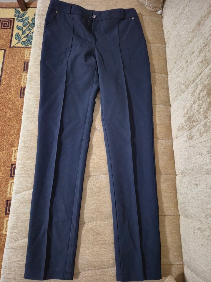 Lacivert kumaştan, pilili ve normal boy midi uzunluğunda kadın pantolon. Denim malzemeden üretilmiş, ofis için uygun, sade ve normcore tarzda.