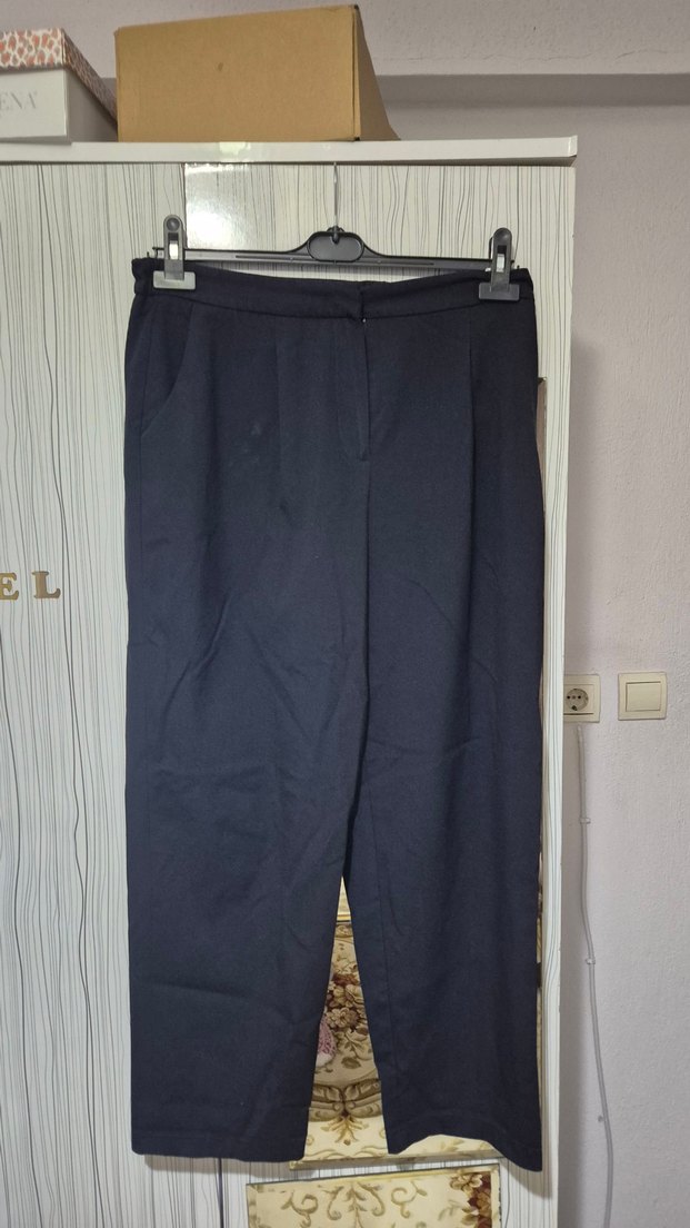 Lacivert kadın kumaş pantolon, normal boy ve pileli tasarıma sahip. Ofis ve gündelik iş ortamları için uygundur, yumuşak sentetik kumaştan üretilmiştir. Deformesi yok ihtiyaç fazlası olduğu için satıyorum