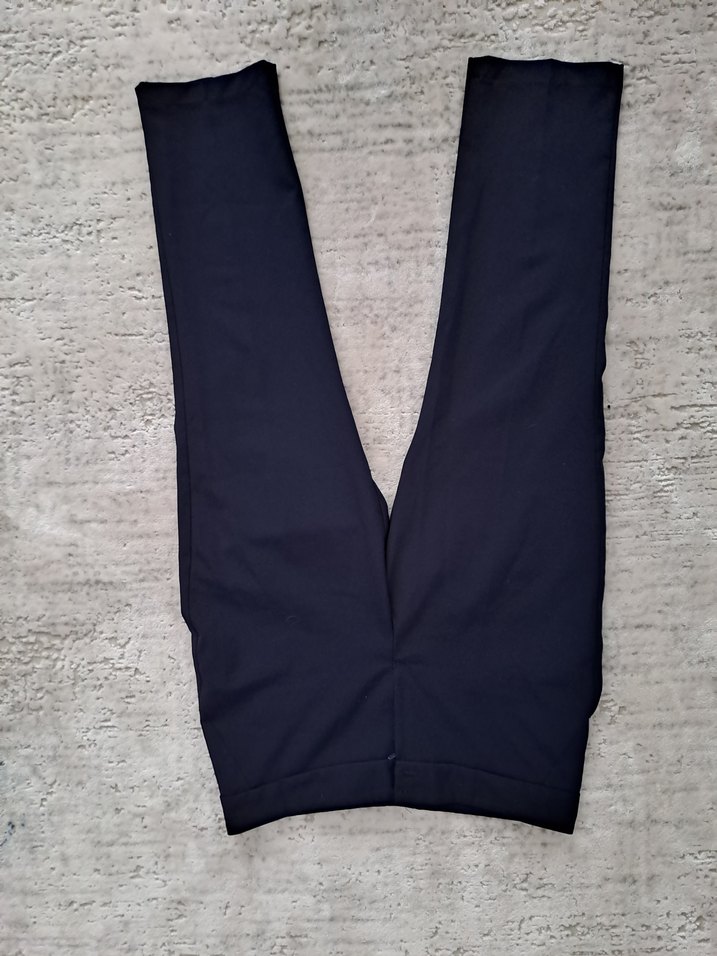 Lacivert renkte, sentetik kumaştan, normal boy midi kadın pantolon. Düzenli kesimle ofis için sade ve şık bir görünüm sunar.