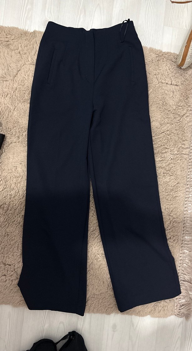 Lacivert renk, normal kesim ve midi boy kadın kumaş pantolon. Yumuşak ve sıcak kumaştan, ofis için uygun sade ve şık tarzda.