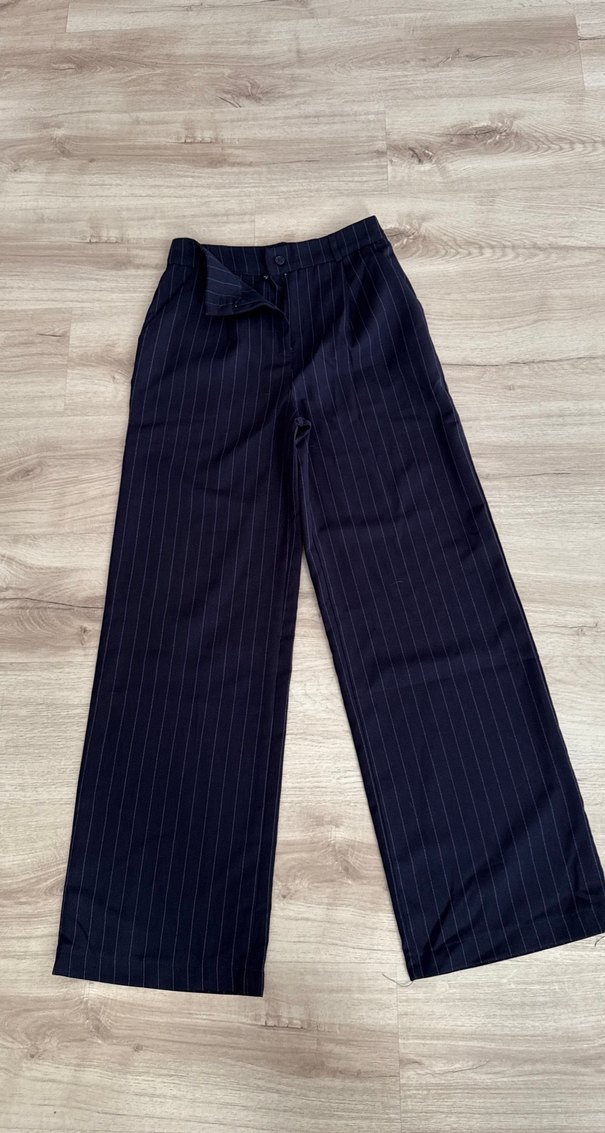Lacivert renkte, regular fit ve pilili kadın kumaş pantolon. Sentetik kumaştan üretilmiş, midi boy ve iş ile günlük sokak stiline uygundur. ✨