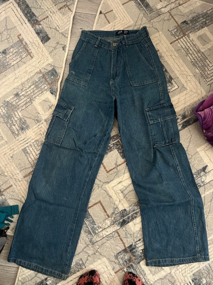Lacivert renk, midi boy, bol kesim kadın denim pantolon. Kargo cepli ve günlük kullanıma uygun rahat bir sokak stili ürünü.