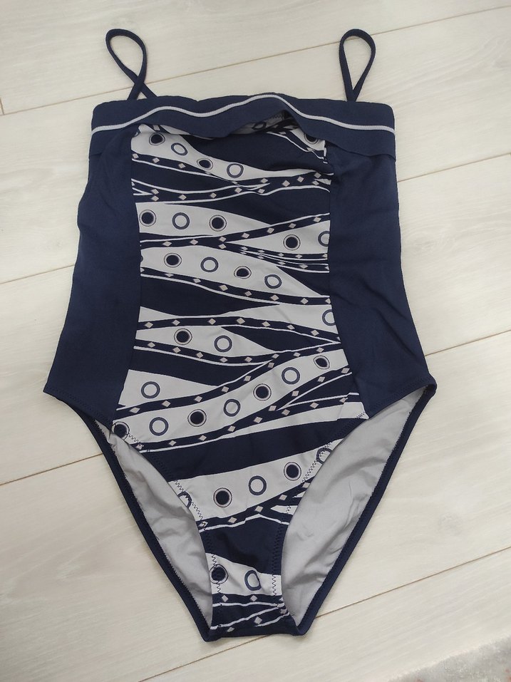 Lacivert renkli, esnek kumaşlı, ön kısmı gri desenli ve askılı, vücuda oturan kadın mayo. 38 40 beden askıları çıkarılabilir kendınden cupludur