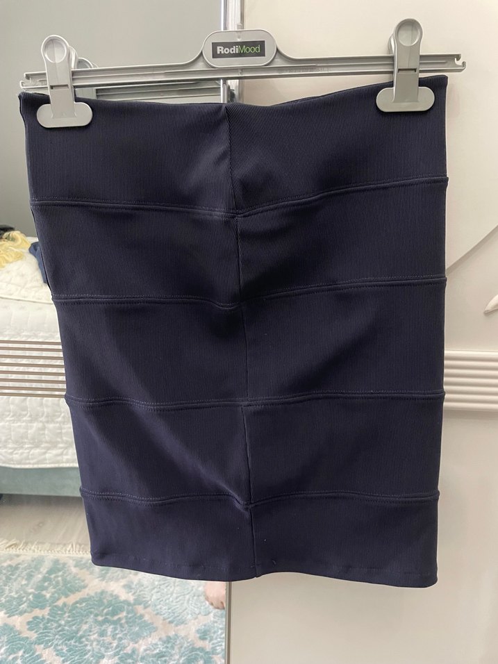 Lacivert renkte, sentetik kumaştan üretilmiş, pile detaylı ve vücuda oturan kadın midi eteği. Ofis ve sokak modasına uygun şık tasarım.