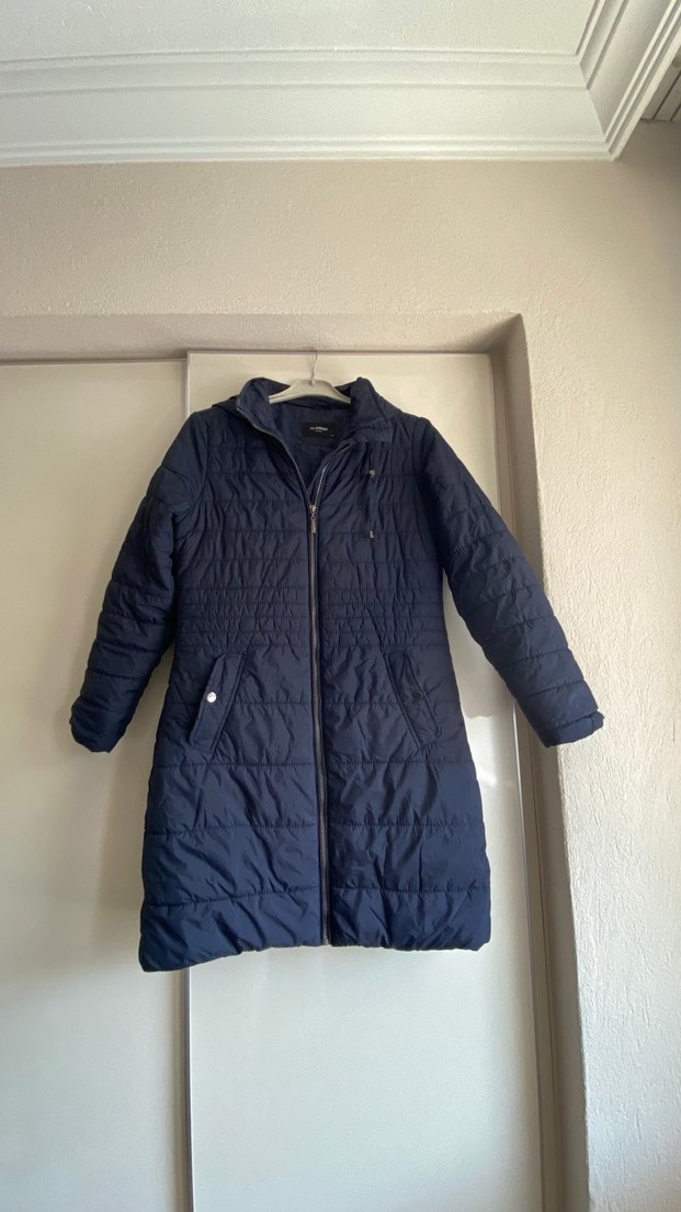 Lacivert , uzun kollu, dik yakalı ve fermuarlı, normal boyda, rahat kesim kadın kışlık mont.