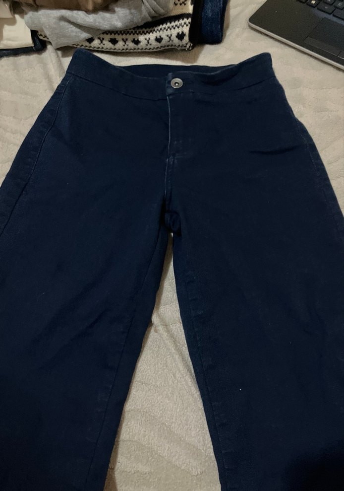 Lacivert renkli, düğmeli, normal boy midi kesim ve dar kalıp kot pantolon, günlük kullanıma uygundur.