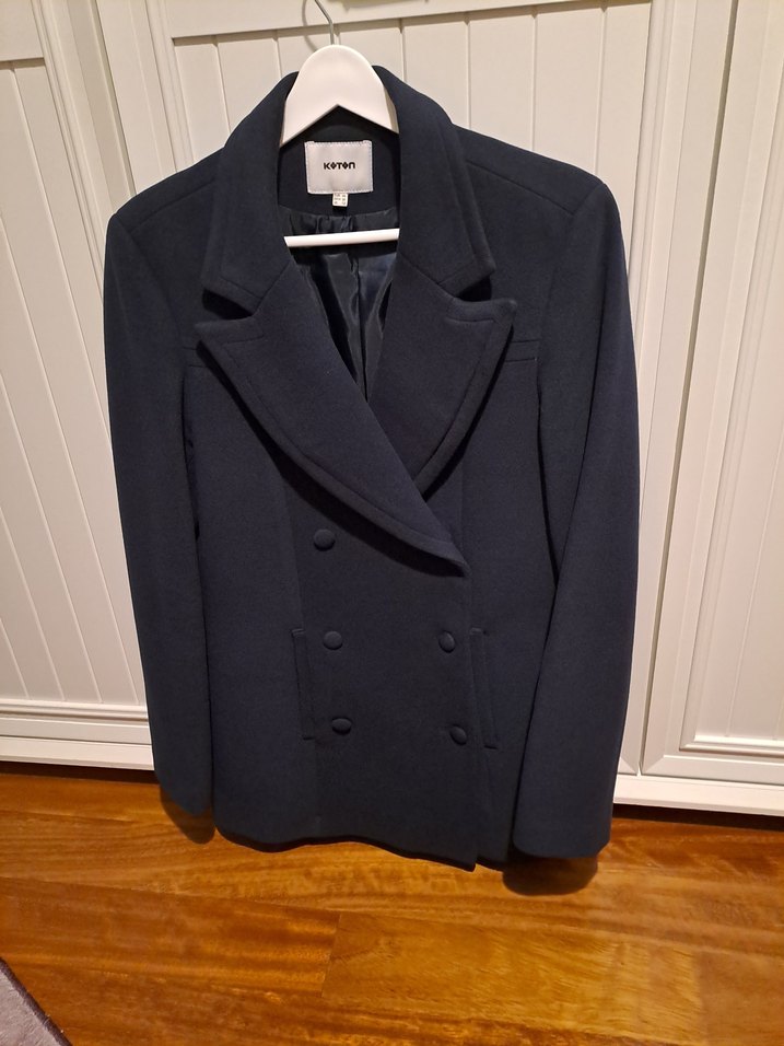 Lacivert renkli, düğmeli, normal kesim, uzun kollu midi kadın kaban. Kruvaze yaka ve yumuşak dokulu kumaşa sahip, klasik ve şık bir tasarım.