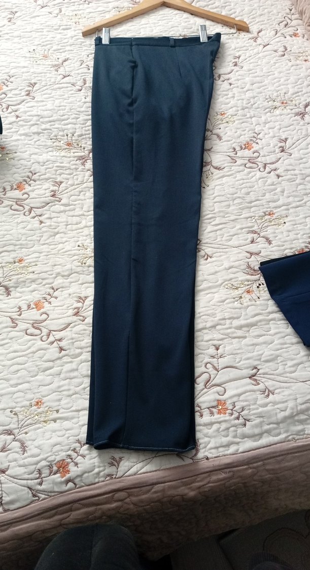 Lacivert midi boy, sentetik kumaştan yapılmış, regular fit ve yırtmaç detaylı kadın pantolonu. Ofis kullanımı için uygundur.
