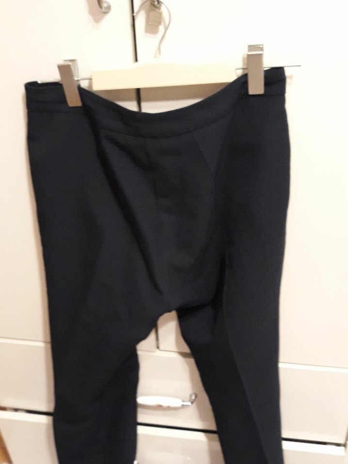 lacivert kumaştan yapılmış, fermuarlı cepleri olan, normal boy midi uzunluğunda, regular fit kadın kumaş pantolon. Ofis için uygundur.