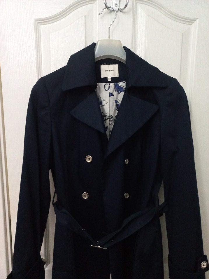 Lacivert midi uzunlukta, düğmeli ve ipeksi kumaştan kadın trençkotu. Notch yakalı ve uzun kollu, baskılı astarlı, ofis için uygun.