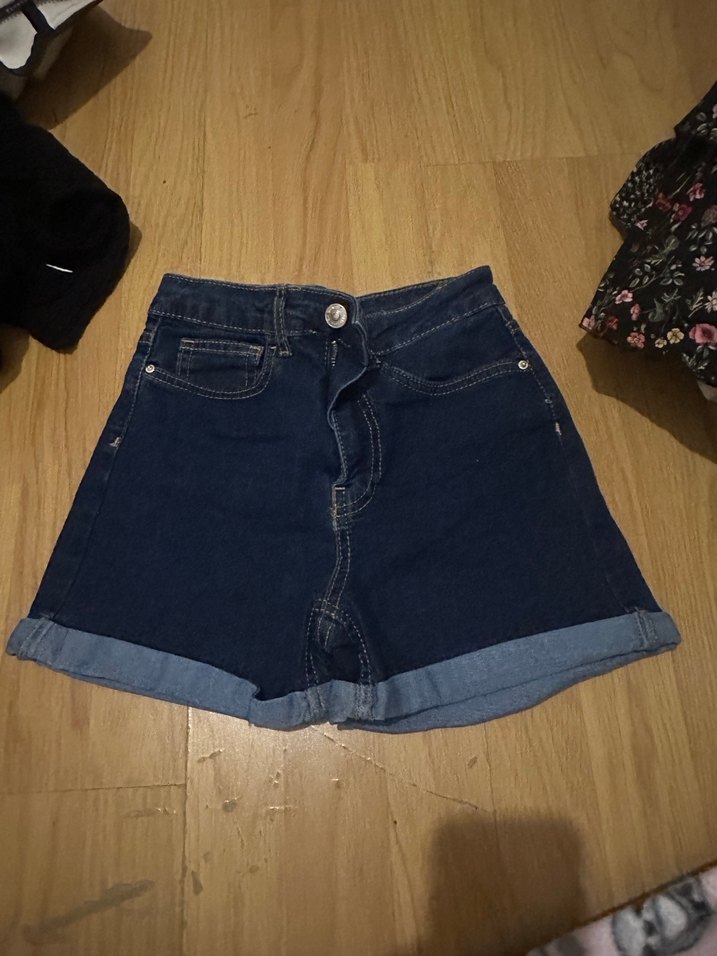 Lacivert mini denim şort, bol kesim ve katlanmış paçalarla günlük sokak stiline uygun rahat bir tasarıma sahiptir.