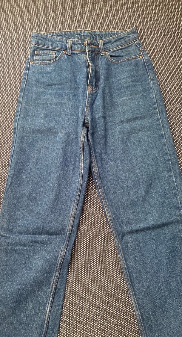 Mavi-tonlarda, denimden yapılmış, mom fit kadın kot pantolon. Günlük kullanıma uygun, desensiz ve zahmetsiz şıklık sunar.