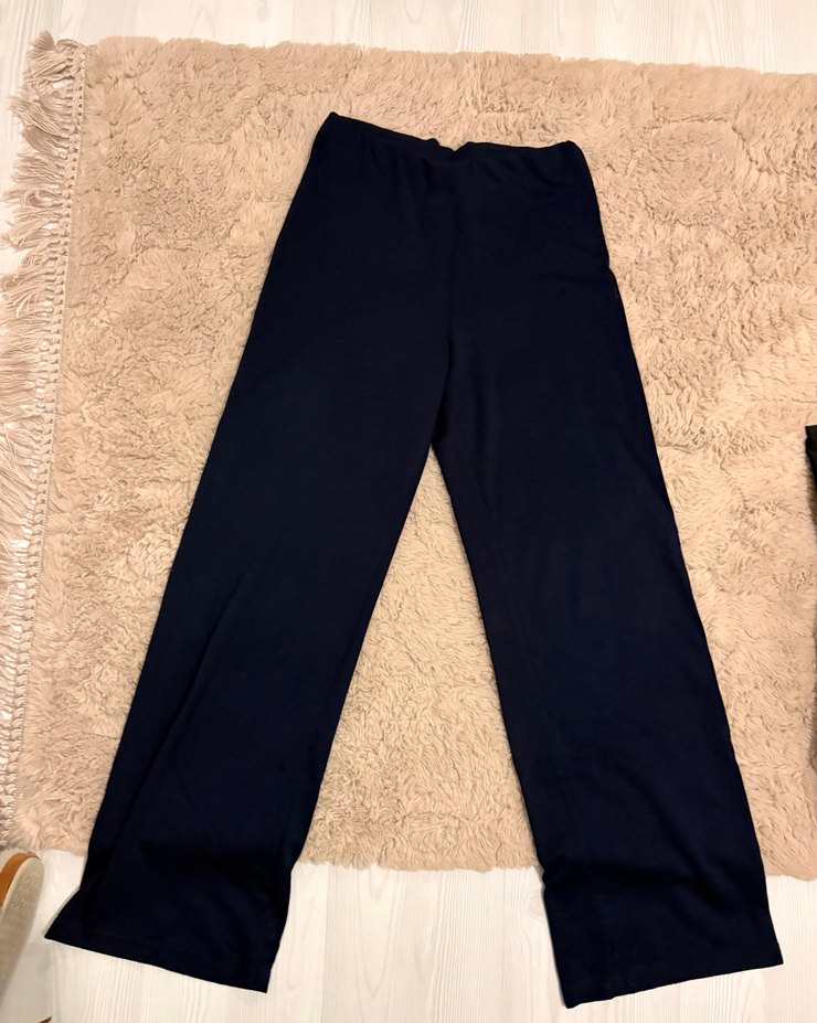 Lacivert, normal kesim, kadife detaylı kadın kumaş pantolon. Orta boy, yumuşak ve sıcak dokulu, günlük kullanıma uygun athleisure tarzı.