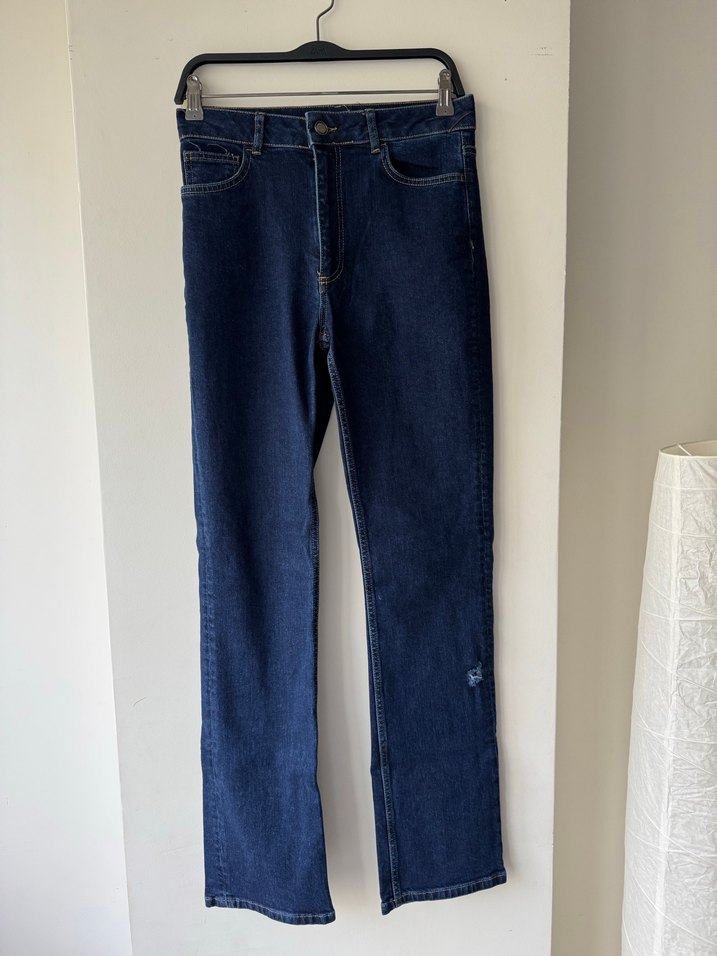Bu lacivert kot pantolon, normal kesim ve midi boyda olup günlük kullanıma uygun rahat ve şık bir tarza sahiptir. Desensiz ve koyu renklidir.