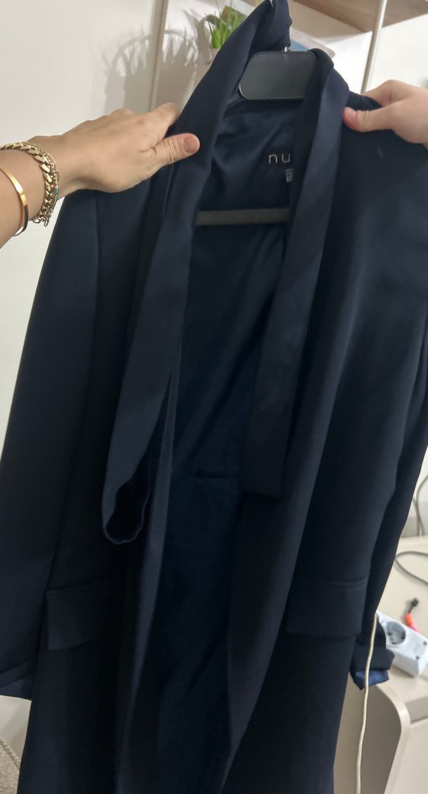 Lacivert, uzun kollu kadın blazer, kesik yaka ve normal kesim. İpek gibi kumaştan, yırtmaçlı ve midi boy, ofis için uygun. ✨38 beden nurs marka yenidir kuşağı mevcut