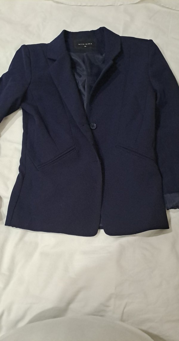 Lacivert renkli kadın blazeri, düğmeli ve kesik yakalıdır. Uzun kollu, normal kalıplı ve yumuşak, sıcak tutan kumaştan yapılmıştır. Ofis için uygun, sade ve midi boydadır.