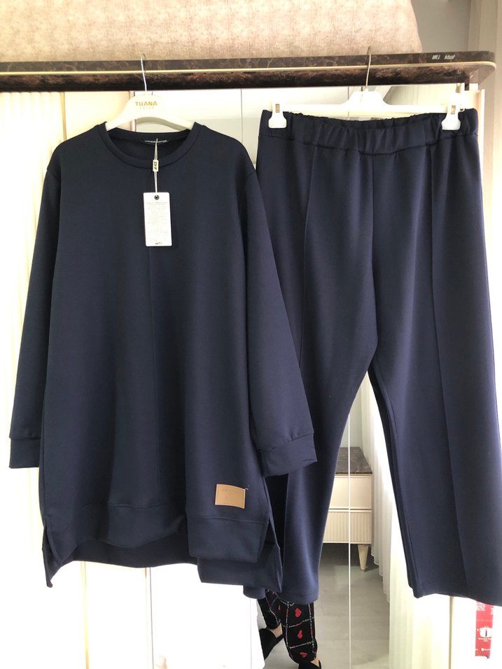 Kadınlar için pamuklu, lacivert renkli, salaş kesim eşofman takımı. Uzun kollu, bisiklet yaka ve desensiz, günlük kullanıma uygun rahat tasarım.