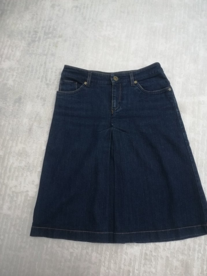 Lacivert kot kumaştan, pileli ve çan kesim trend ve rahat bir tarz sunar. Desensiz, normcore stilde bir modeldir.