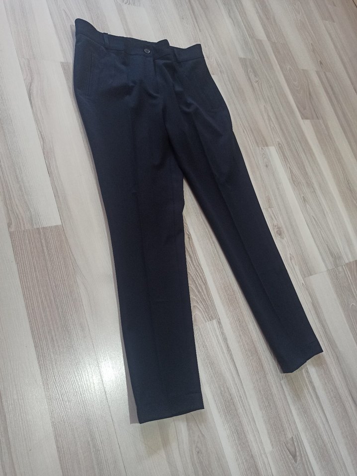 Lacivert kadın kumaş pantolon, normal boy ve pilili tasarıma sahiptir. Ofis kullanımı için uygundur ve rahat bir sentetik kumaştan üretilmiştir.