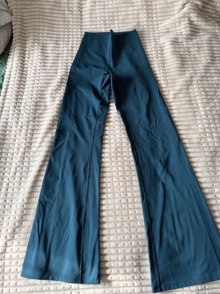 Lacivert renkte, pilili ve uzun paçalı kadın pantolonu. Düz, sentetik kumaştan üretilmiş, spor için uygun normcore tarzda rahat bir model.