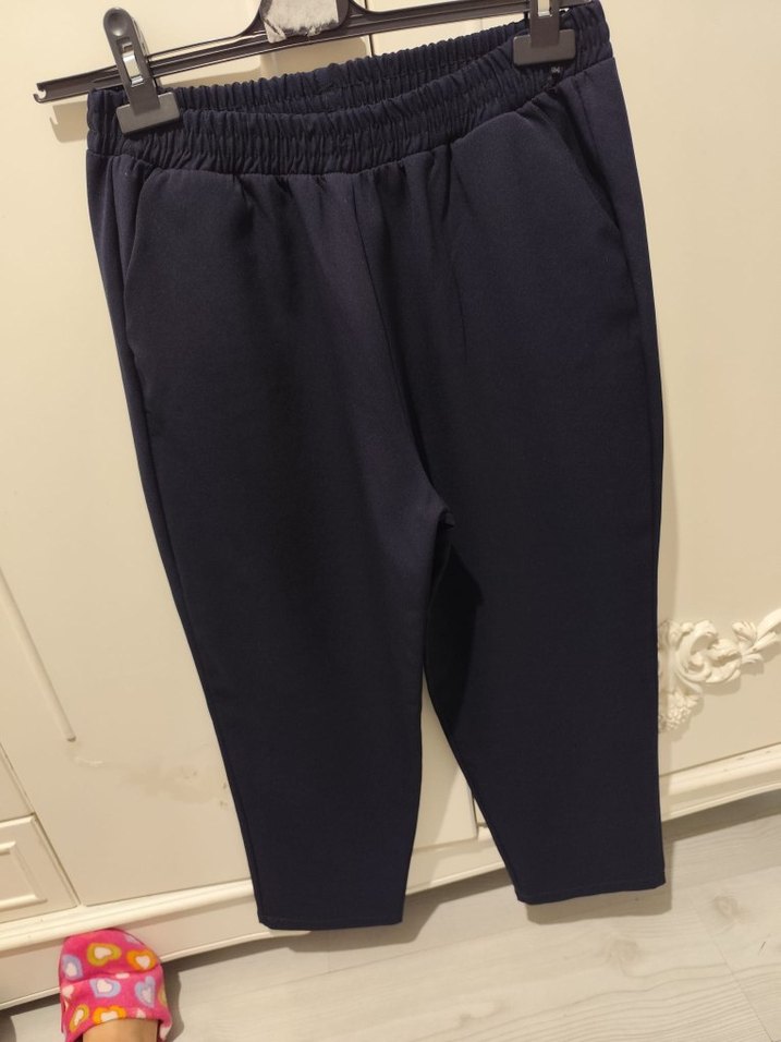 Lacivert renkte, elastik bel bantlı, rahat kesim midi uzunlukta kadın kumaş pantolon. Günlük kullanıma uygun, yumuşak sentetik kumaştan üretilmiştir.