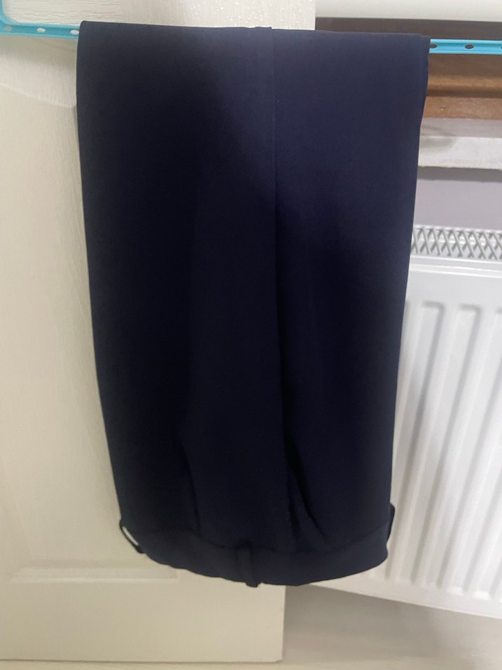 Lacivert renkte, regular fit kesim ve normal boyda, piliseli detaylı kadın kumaş pantolon. Ofis ve iş ortamları için uygun, sentetik kumaştan üretilmiştir.