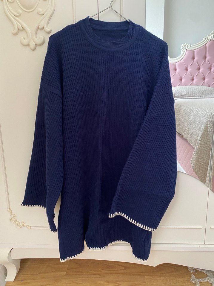 Lacivert renkli, örgü kumaştan yapılmış, salaş kesim uzun kollu ve yuvarlak yaka kazak. Günlük rahat kullanıma uygun, desen içermeyen konforlu tasarım. Triko tunik