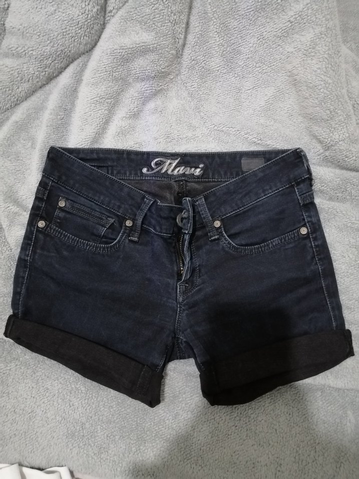 Düğmeli ön kısmı ve hafif batik desenli, siyah renkli, dar kesim kadın mini denim şort.