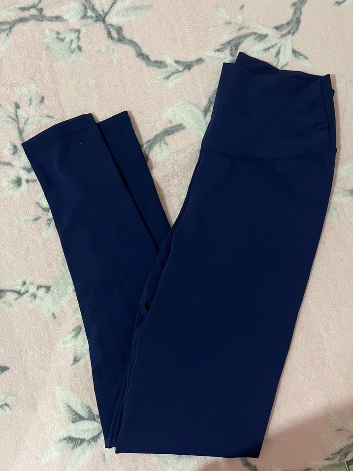 Lacivert renkte, elastik bel bantlı, midi boyda, yumuşak sentetik kumaştan yapılmış, günlük sokak giyimine uygun kadın spor taytı. ♀️