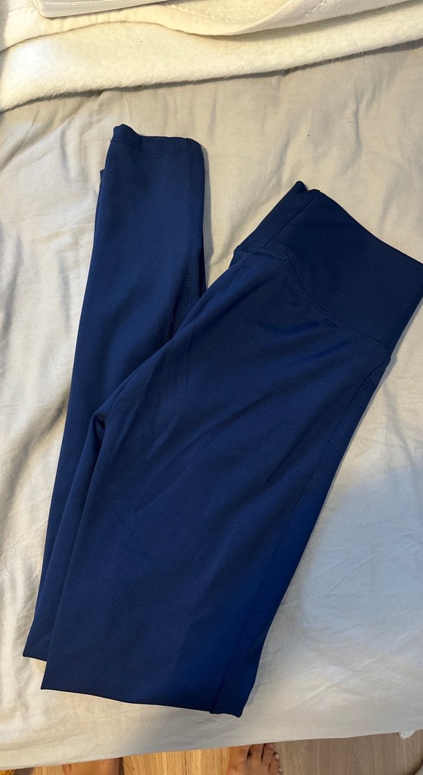 Lacivert renkli, vücuda oturan kadın spor tayt, midi boy ve pürüzsüz sentetik kumaştan, günlük sokak stili için rahat ve şık.