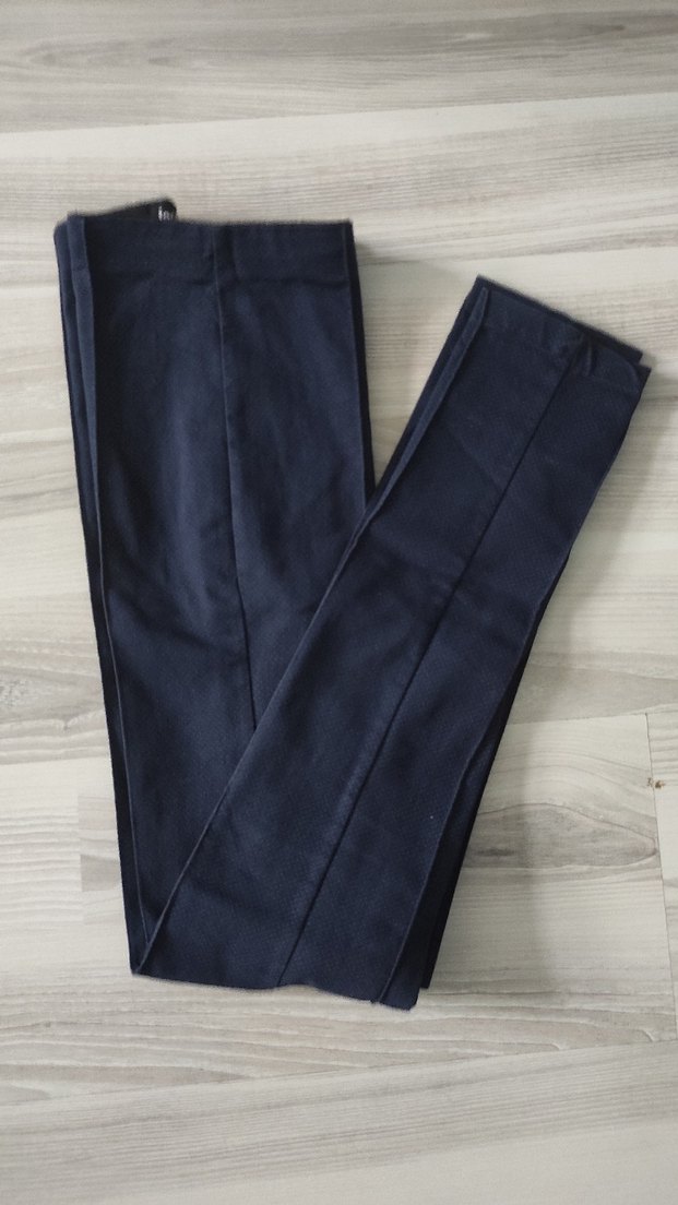 Lacivert, kendinden desenli, dar paçalı, pileli detaylı kadın tayt pantolon. Rahat kesimi ve iş ortamına uygun sade tasarımıyla öne çıkar. Ürün birkaç kez kullanılmış olup defosuzdur. S bedendir fakat dar kesim olduğu için XS kalıba da uygundur. Cepsizdir. Belinin solunda fermuar bulunur. Ölçüleri; belden boyu 91 cm, paça genişliği 12,5 cm, bel genişliği 32 cm'dir.