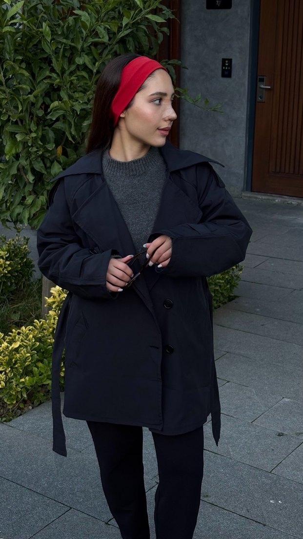 Siyah midi uzunlukta,kadın trençkot.1 ve 2 beden seçeneği mevcuttur,özel dikimdir