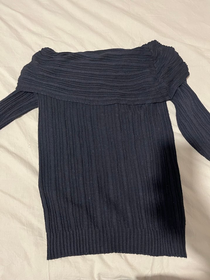 Lacivert kadın triko bluz, kayık yaka ve uzun kolludur. Yumuşak, örme keten kumaştan yapılmış, vücuda oturan ve normal boydadır. Rahat sokak stili için uygundur.