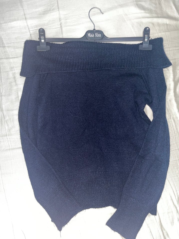 Lacivert Kadın Triko Kayık Yaka Uzun Kollu
