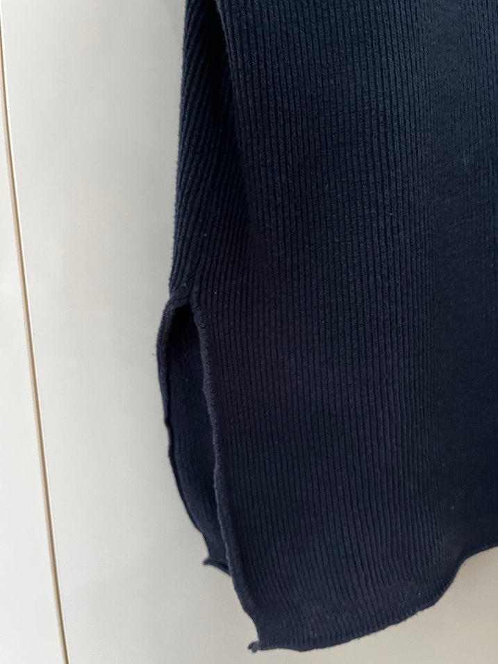 Lacivert renkte, uzun kollu, örgü kadın kazak. Normal midi boyda, desen içermeyen rahat bir tasarıma sahiptir.