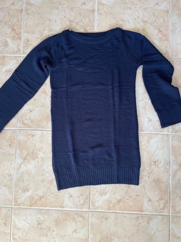 Lacivert renkli, yuvarlak yaka uzun kollu kadın triko kazak. Örme kumaştan, vücuda oturan kesim ve midi boyda, günlük kullanıma uygun.