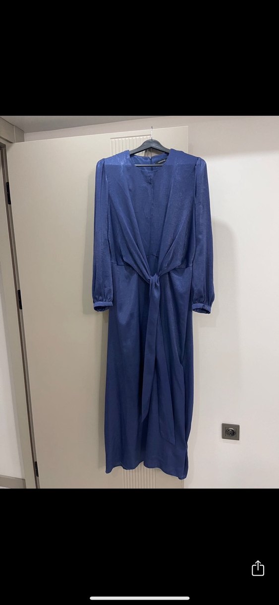 Lacivert uzun drapeli elbise, yumuşak dokulu ve bol kesimdir. Uzun kollu ve V yakalı, ofis için uygun modern tarzda. ✨