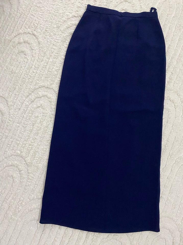 Lacivert uzun etek, drapeli ve normal kesimdir. Yumuşak ve sıcak kumaştan üretilmiştir. Minimalist tarz ve ofis kullanımı için uygundur.
