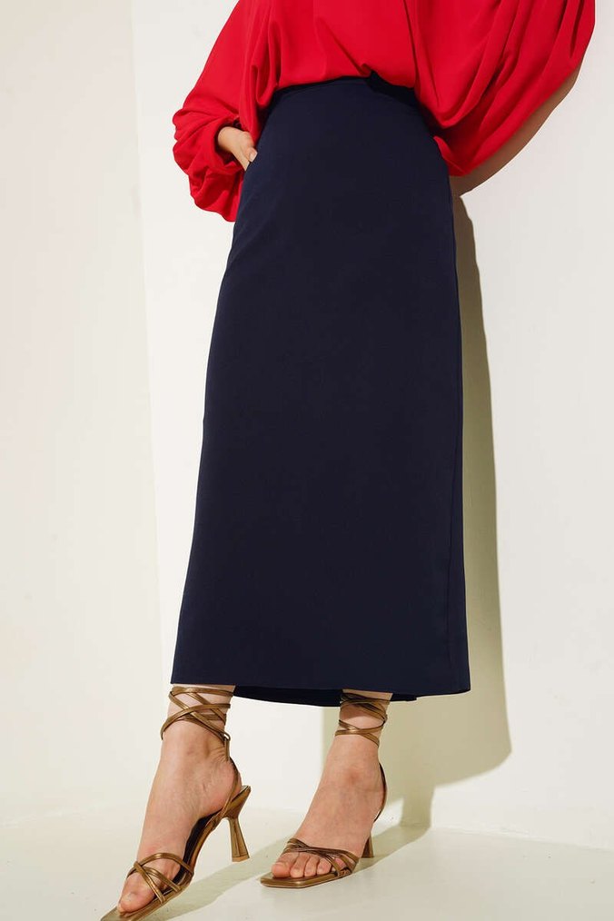 Lacivert renk, uzun kesim ve düz yapısıyla ofis için uygun, sade ve şık kadın eteği.