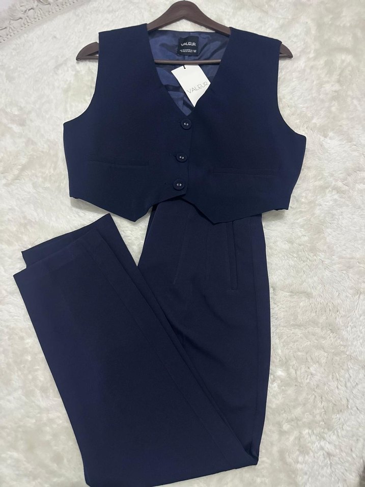 Lacivert renkte, düğmeli yelek ve uzun kesim pantolondan oluşan kadın takımı. Sentetik kumaştan, klasik ve iş ortamına uygun tasarım.