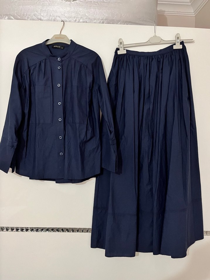 Lacivert uzun keten pilili etek, bol kesimi ve yumuşak dokusuyla ofis ortamına uygundur.