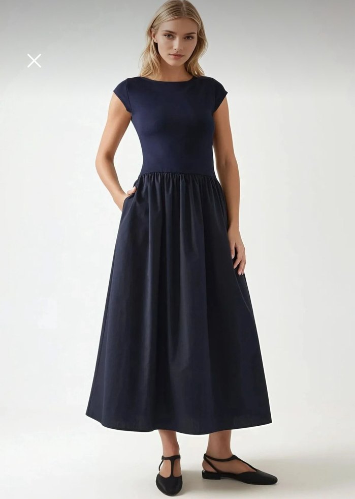 Lacivert uzun elbise, kayık yaka ve kolsuz tasarıma sahiptir. Düz kesimi ve parlak sentetik kumaşı ile modern klasik bir görünüm sunar. Ofis için uygundur ve rahat şıklık sağlar.