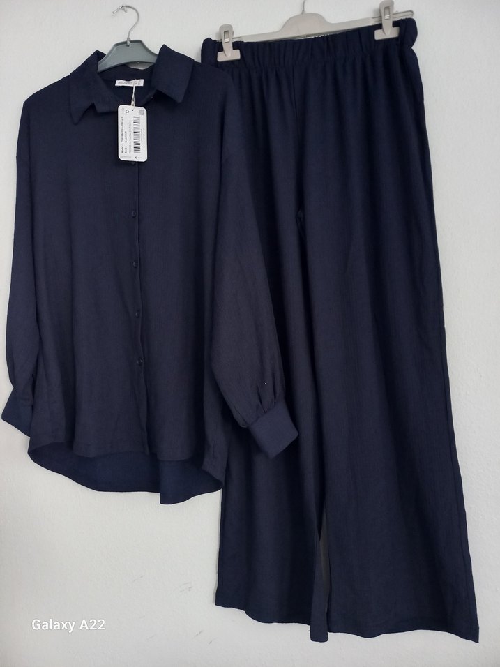 Lacivert keten kumaştan, düğmeli, uzun kollu ve uzun kesim kadın gömlek. Notched lapel yakaya sahiptir, rahat ve günlük kullanım için uygundur.
